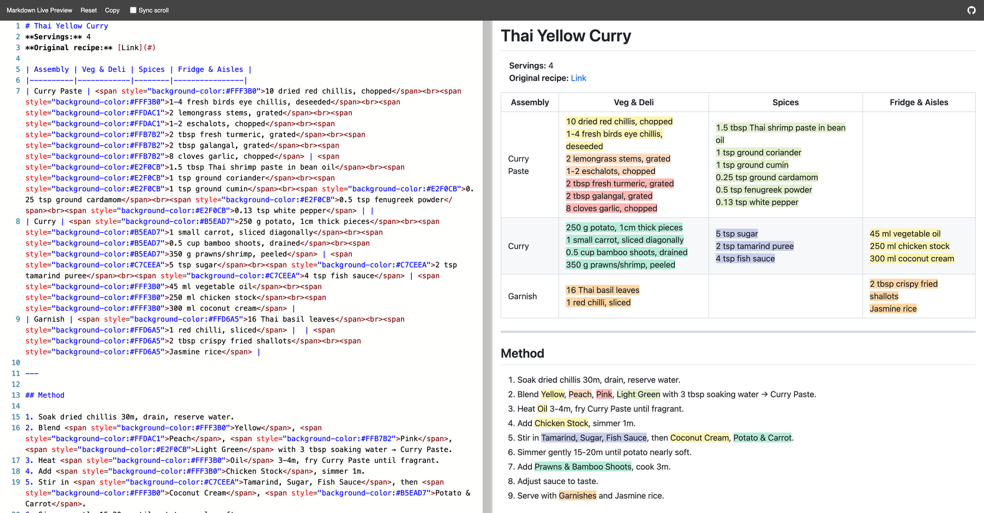 Ingredients that are added together, share the same colour. This allows the method to shrink from a long "Add oil, tomato paste, salt, pepper etc...", to simply: "Add Yellow".