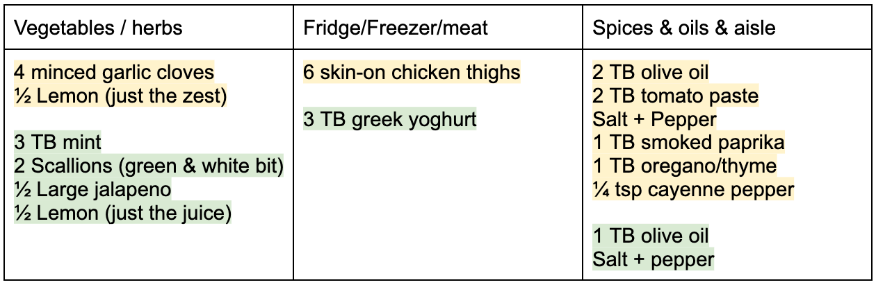 - Group ingredients by where I buy them and by recipe sub-assemblies.