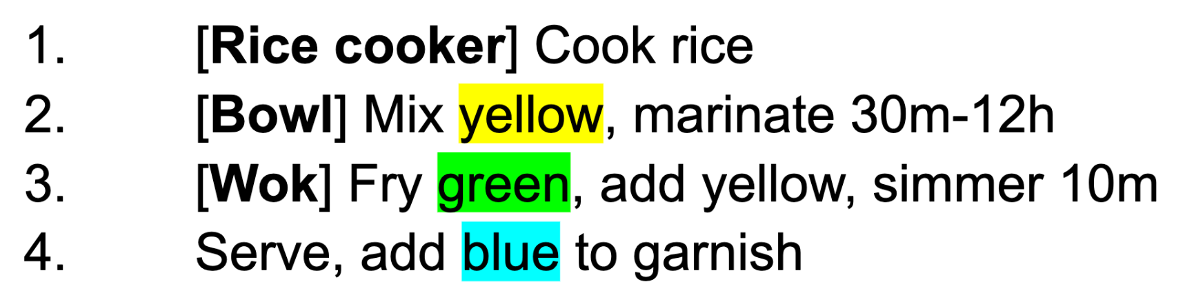 - Use short, mechanical actions (e.g., “Fry 5m”, “Simmer 10m”, “Cover”).